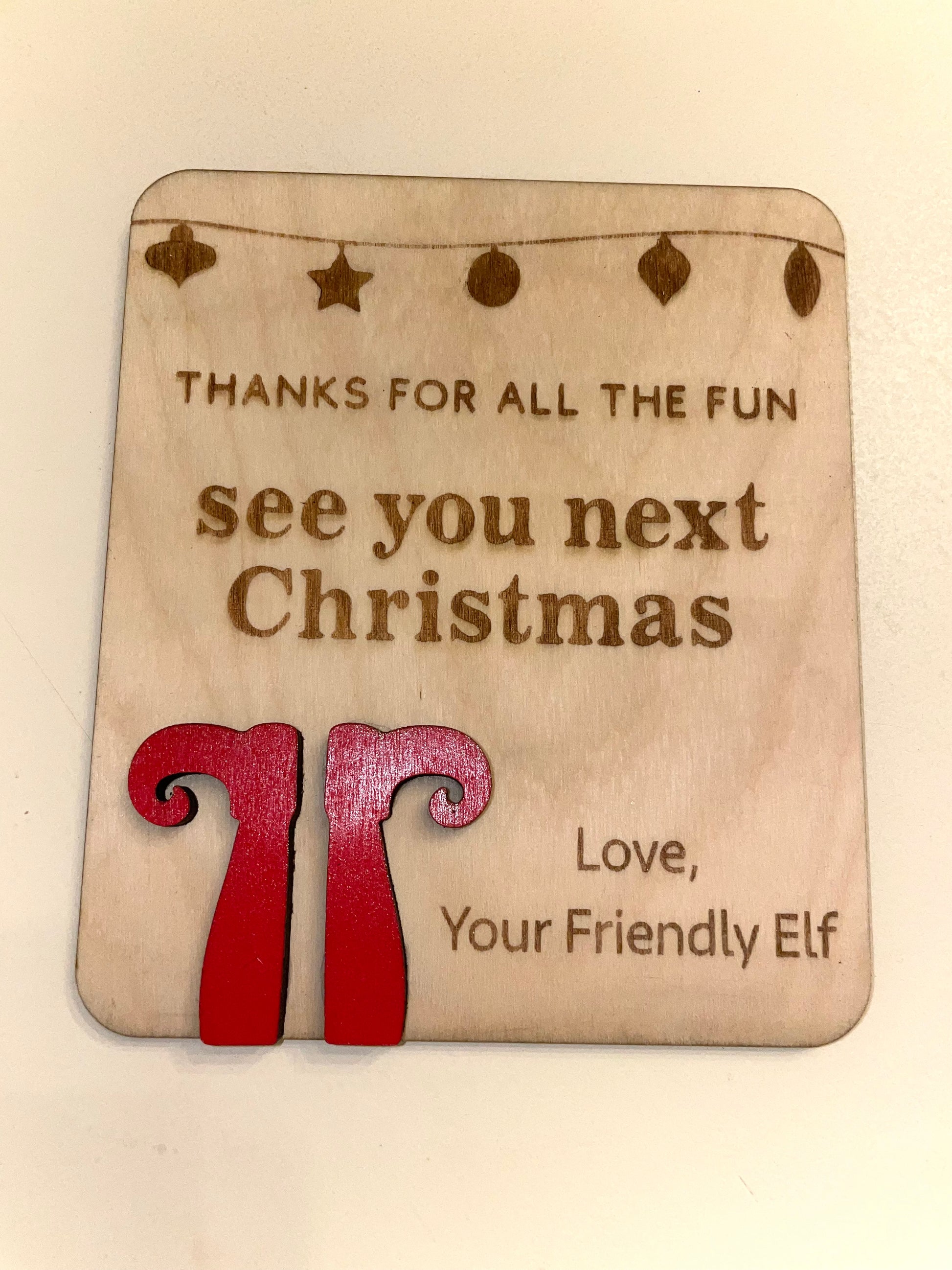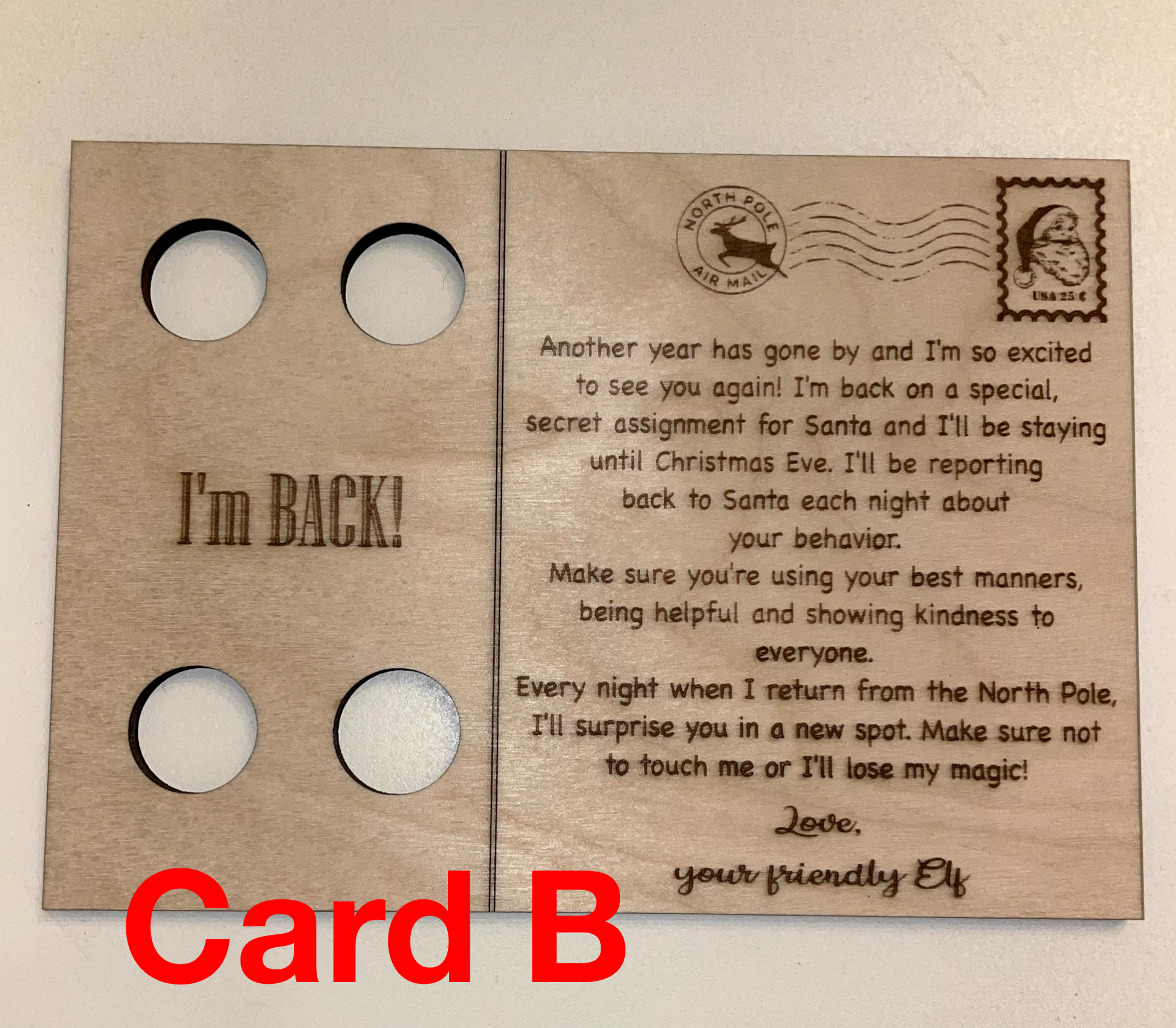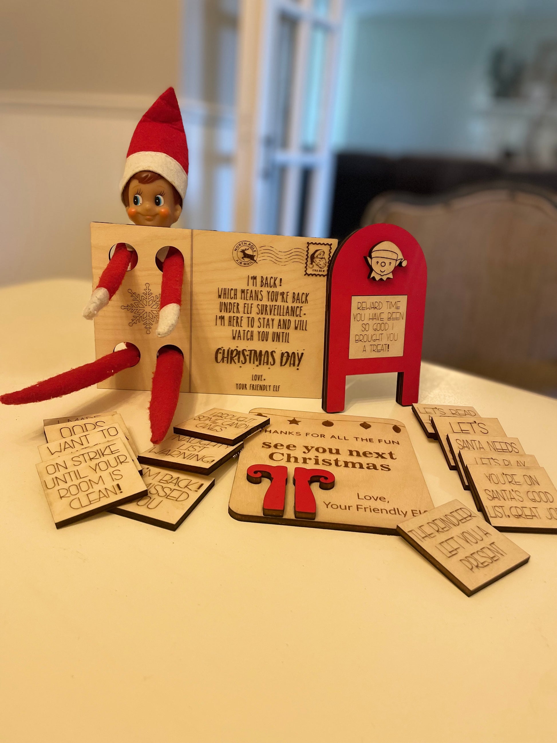 Our engraved wooden “I’m Back!” boards make the perfect Elf-on-the-Shelf kickoff. Each reusable card is designed with arm and leg holes to hold your Elf in place — and our themed prop sets add instant fun for easy daily Elf scenes!