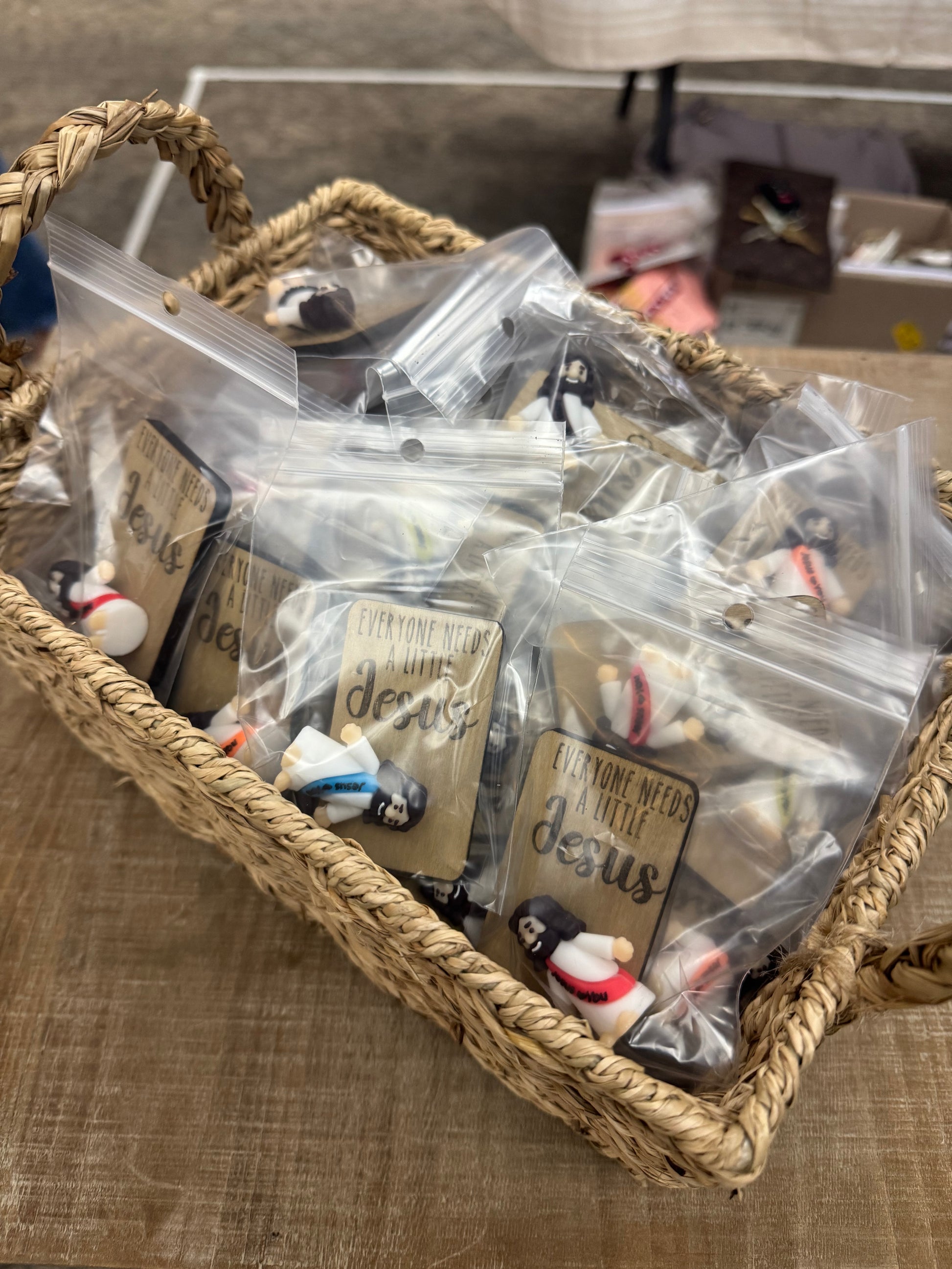 Give a sweet, meaningful reminder with these “Everyone Needs a Little Jesus” mini blessing bags. Each set includes a laser-engraved wooden tag paired with an adorable handmade mini Jesus figure — a perfect little pick-me-up for friends, coworkers, church groups, teachers, and anyone who could use a smile.